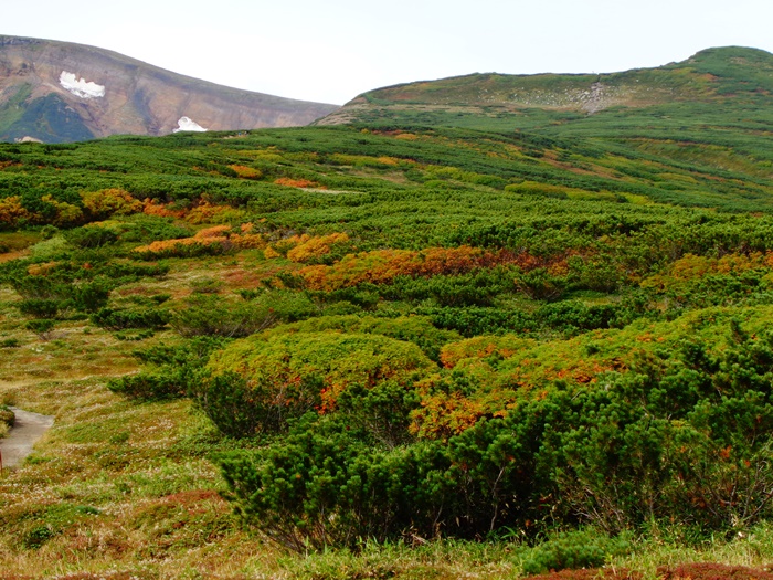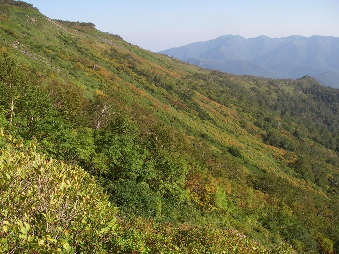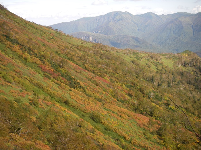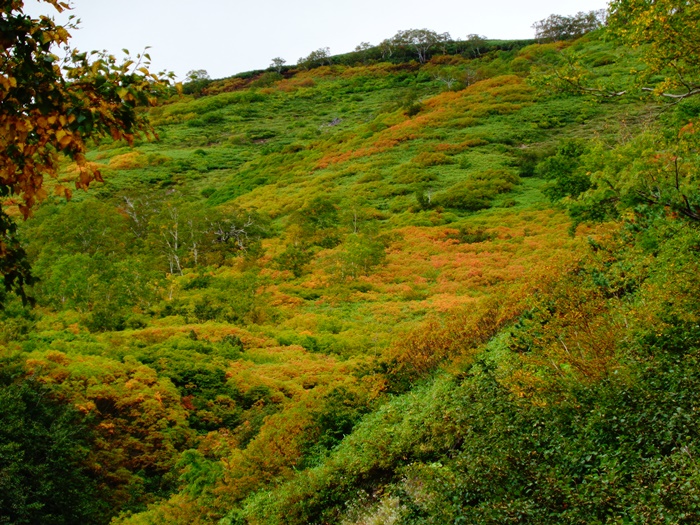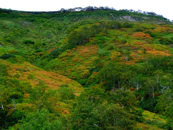 黒岳から北海岳方面、北鎮岳方面のウラジロナナカマドは、まだ緑葉からの色付き始め・橙色
