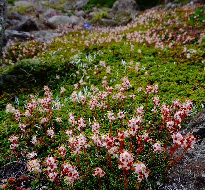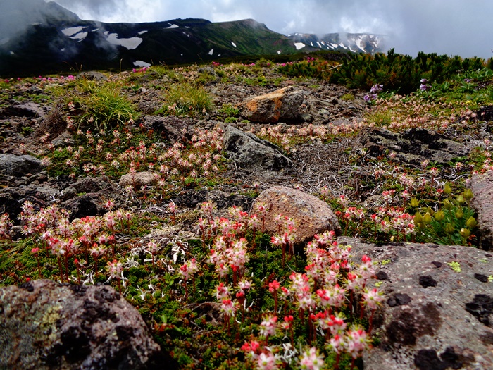 小泉平:イワヒゲ・ミヤマキンバイ終 メアカンキンバイ・エゾノマルバシモツケ・エゾイワツメクサ↓ ヒメイワタデ・クモマユキノシタ・エゾハハコヨモギ・コマクサ○ リシリリンドウ・チシマギキョウ↑