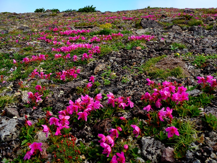 第二花園:キバナシャクナゲ・エゾコザクラ・ミヤマキンバイ・チングルマ・エゾノツガザクラ・ジムカデ↑