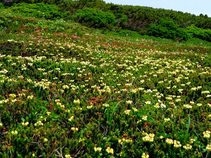 奥の平:コエゾツガザクラ・ウコンウツギ・ミヤマキンバイ・エゾコザクラ↓ チングルマ〇 アオノツガザクラ・エゾヒメクワガタ・シラネニンジン↑