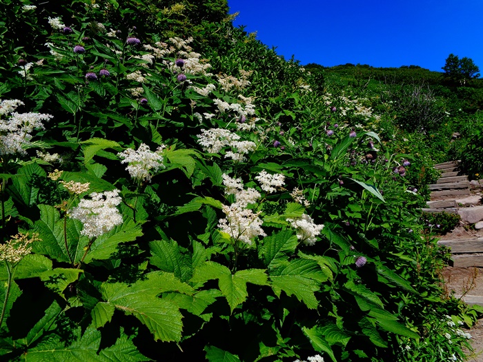 第一花園:ミヤマキンバイ・エゾコザクラ↓ チングルマ・カラマツソウ〇 ウコンウツギ・ハクサンボウフウ・マルバシモツケ・ハイオトギリ・エゾウサギギク・ミヤマアキノキリンソウ・ヨツバシオガマ・エゾヒメクワガタ↑ ウメバチソウ始