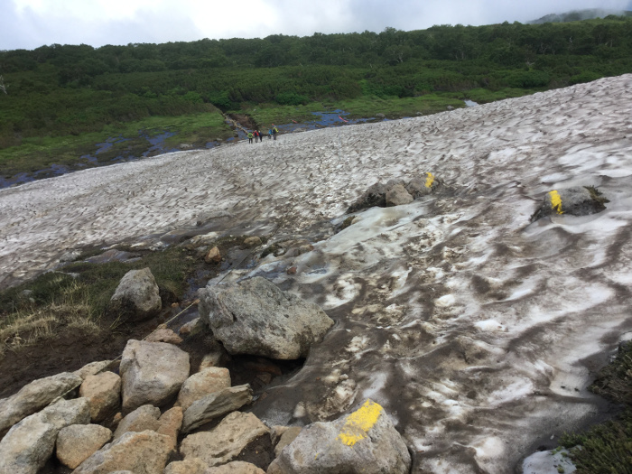 第三雪渓:ハクサンフウロ・シラネニンジン・エゾヒメクワガタ・アオノツガザクラ↓ イワギキョウ・ヨツバシオガマ・エゾウサギギク〇 ミヤマリンドウ↑ ウメバチソウ・ミヤマアキノキリンソウ始