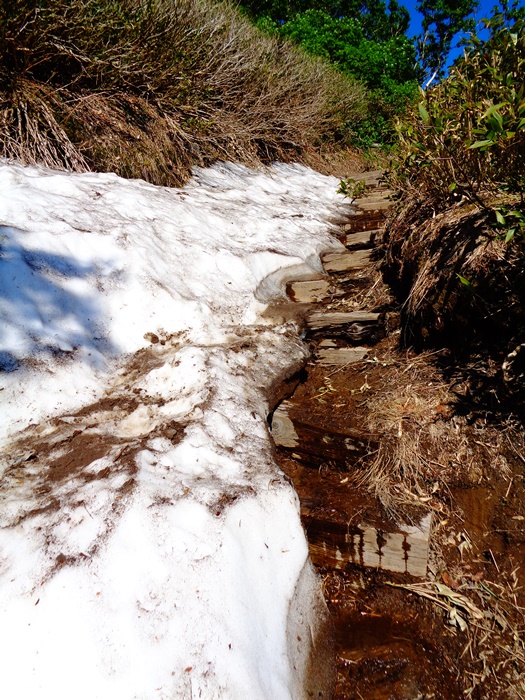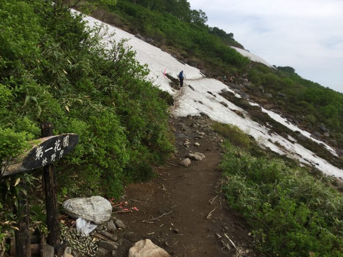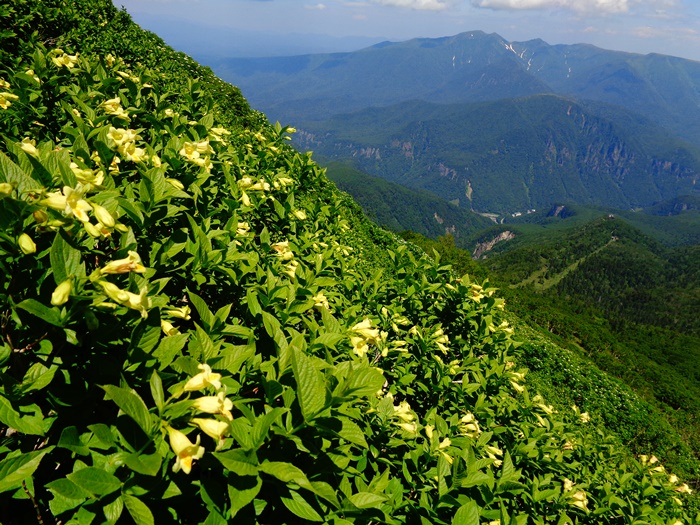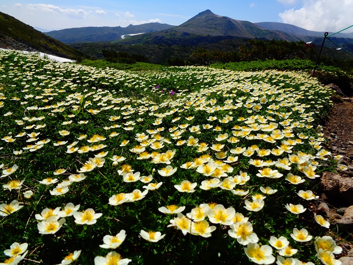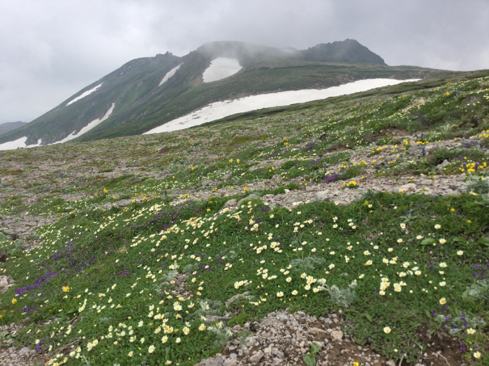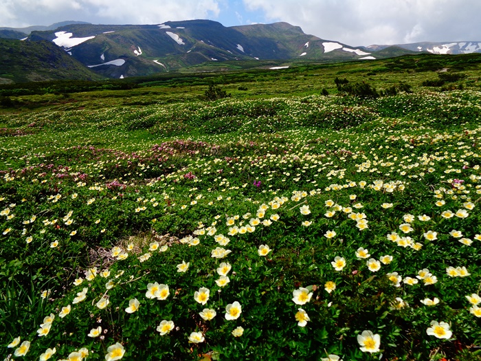 白雨小屋周辺:エゾノハクサンイチゲ・エゾコザクラ・ミネズオウ・キバナシャクナゲ・ミヤマキンバイ・エゾオヤマノエンドウ↓ コエゾツガザクラ・ウコンウツギ・チングルマ〇 アオノツガザクラ・キバナシオガマ・エゾハハコヨモギ・トカチフウロ・ミヤマキンポウゲ・チシマノキンバイソウ・エゾノリュウキンカ↑