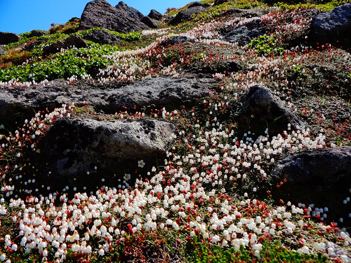第三雪渓周辺:イワウメ・キバナシャクナゲ・エゾコザクラ↓ チングルマ・ウコンウツギ・ジムカデ・エゾノツガザクラ・アオノツガザクラ・コエゾツガザクラ↑