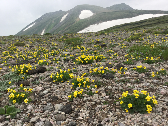 赤岳周辺:エゾオヤマノエンドウ・ホソバウルップソウ・イワウメ・メアカンキンバイ↓ タカネスミレ・チョウノスケソウ○ キバナシオガマ・エゾタカネツメクサ・イワヒゲ・エゾハハコヨモギ↑