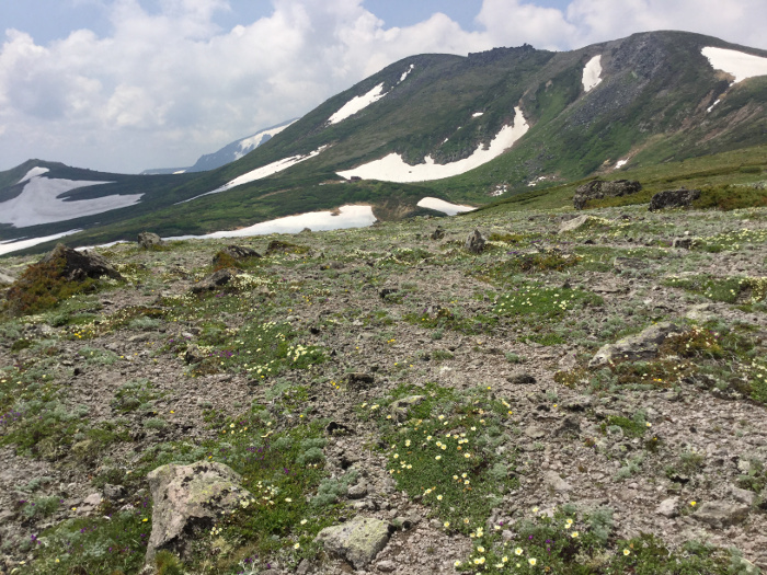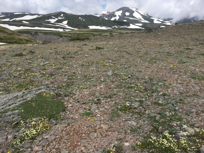 板垣分岐周辺(稜線上):エゾオヤマノエンドウ・ミヤマキンバイ・イワウメ・エゾノハクサンイチゲ↓ チョウノスケソウ・ホソバウルップソウ〇 タカネスミレ・コマクサ・キバナシオガマ↑ エゾタカネツメクサ・エゾハハコヨモギ・チシマキンレイカ始