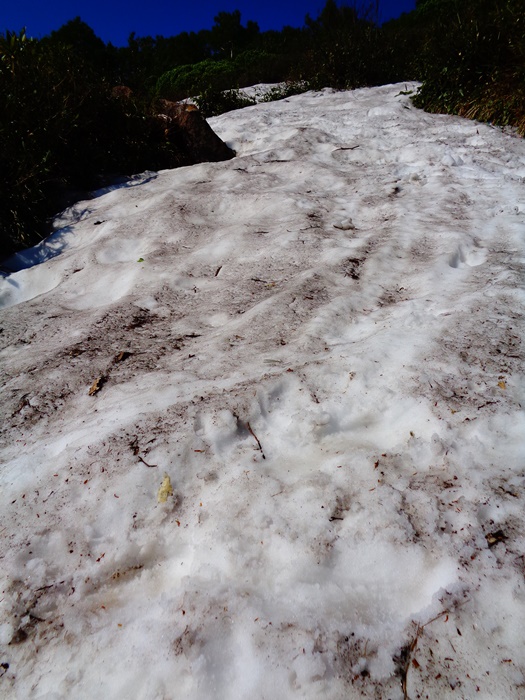 ハイマツ帯では1箇所残雪の上を渡りますが、岩塊斜面から上はすべて夏道です。