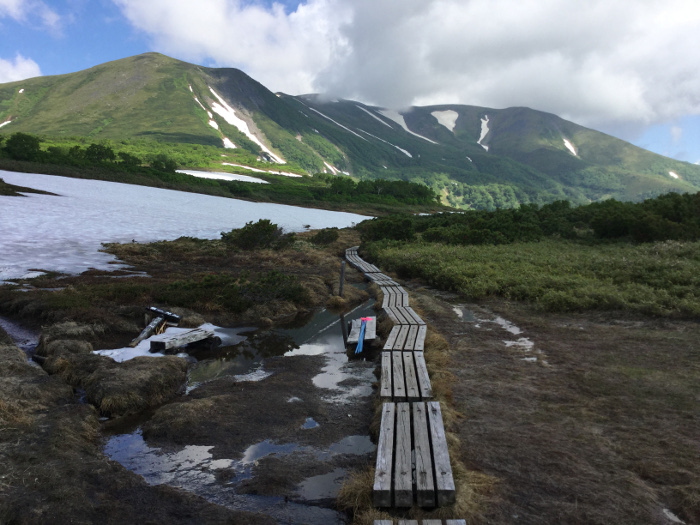 第一花畑は、木道がほぼ露出し、端部の斜面に残雪があるだけです(写真①)。