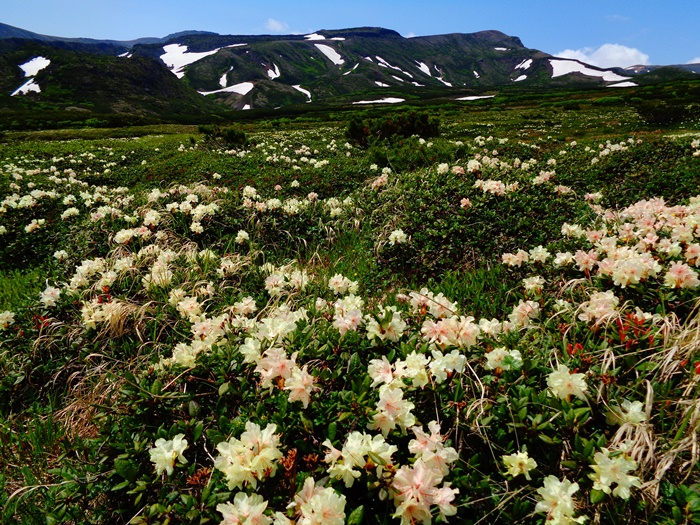 小泉平:エゾオヤマノエンドウ・イワウメ・メアカンキンバイ・エゾノハクサンイチゲ↓ ホソバウルップソウ〇 チョウノスケソウ・エゾタカネツメクサ・タカネスミレ・ミヤマキンバイ・コマクサ↑ エゾハハコヨモギ・チシマキンレイカ・レブンサイコ始