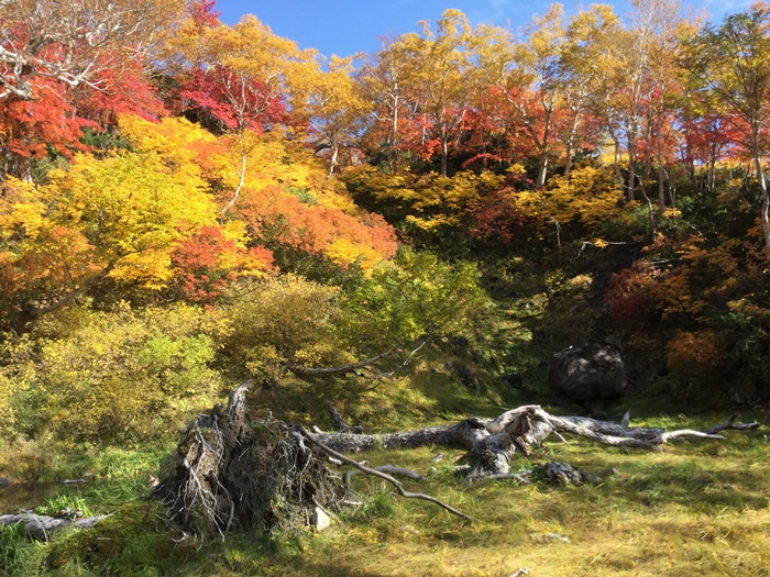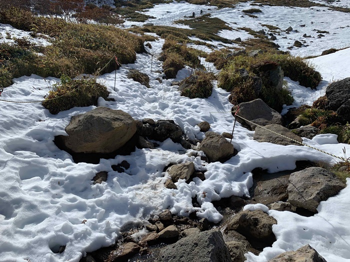 第四雪渓も、雪や風の影響で散っている葉が多く見受けられます。そして登山道は、ほぼ全面雪です。