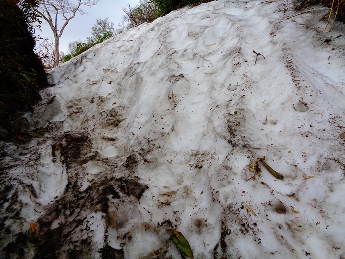 滑落の危険が大です。(本日はやや気温が上がったため、上面は柔らかいですが、その下は氷です)