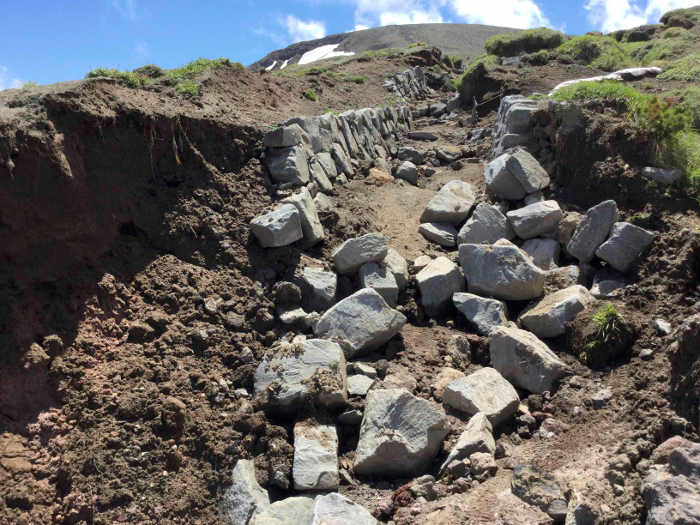 間宮岳から中岳分岐に向かう登山道上にある石垣状の擁壁(通称「間宮城」)の一部が崩れ、