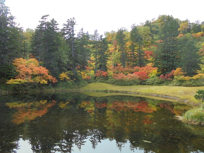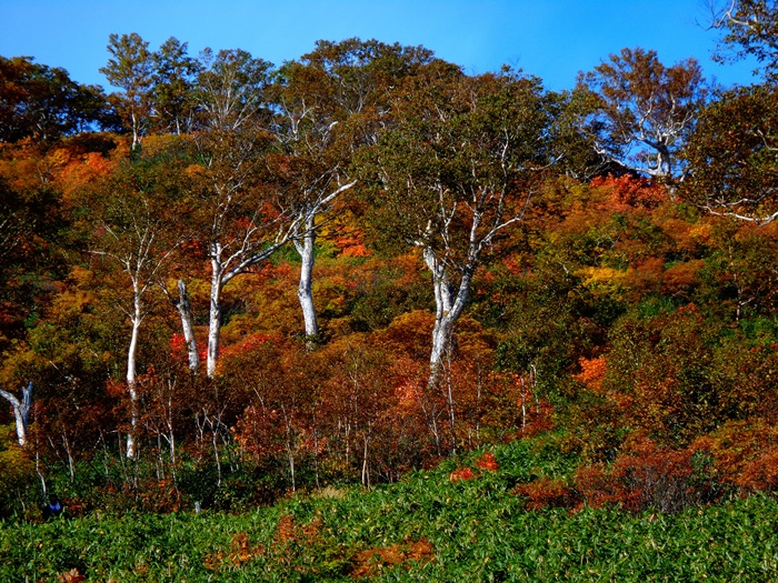 今年の紅葉は、高温等の影響で、ダケカンバやウラジロナナカマドは「葉焼け」の現象もあり、